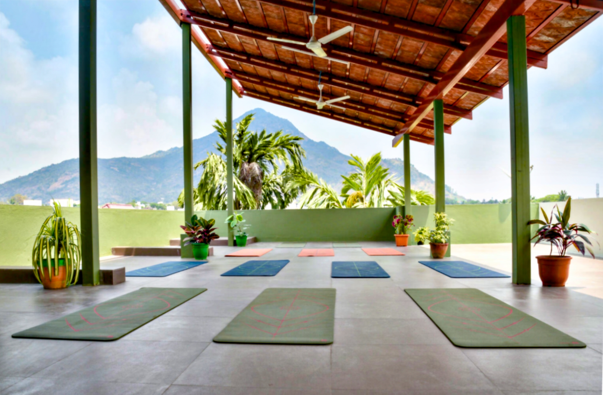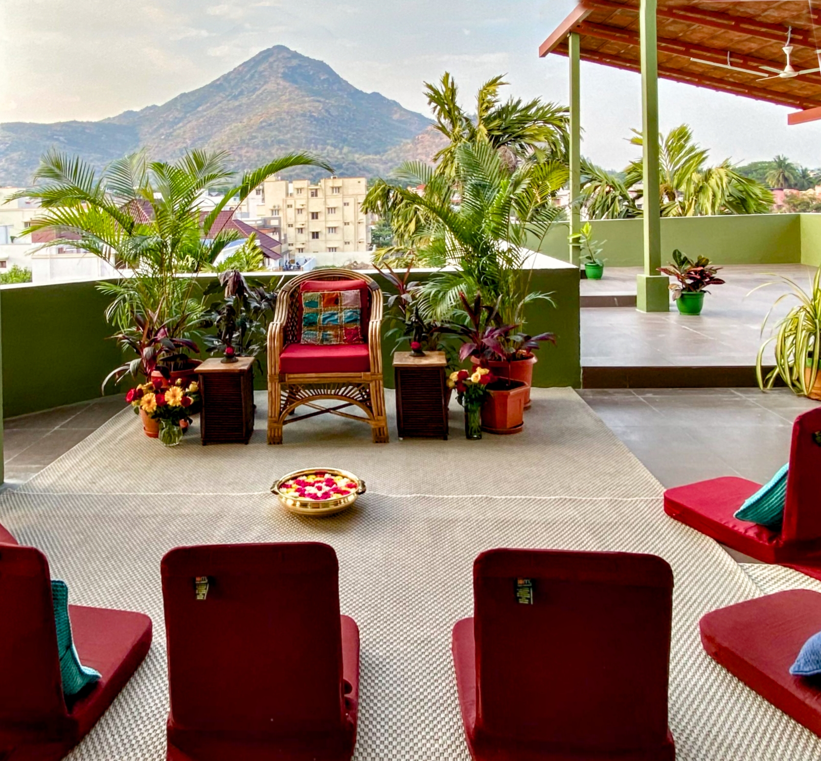 nous offre une vue époustouflante sur la colline sacrée d'Arunachala depuis le toit terrasse ou nous pratiquerons nos étirements de Yoga matinaux.